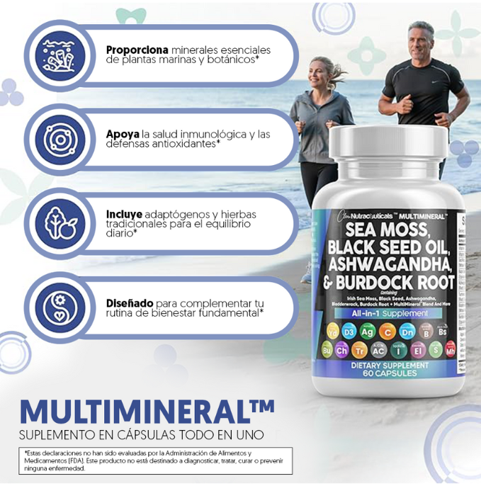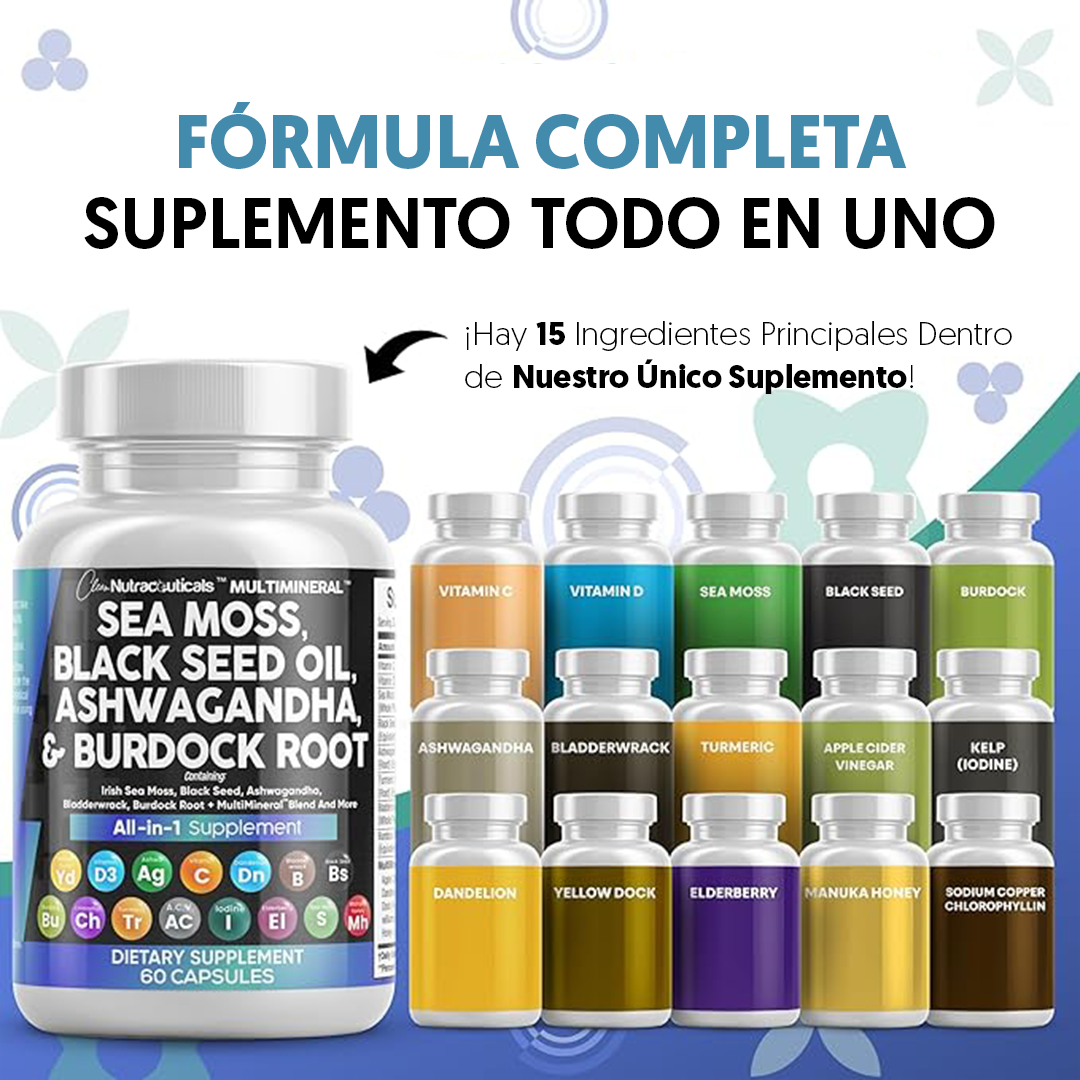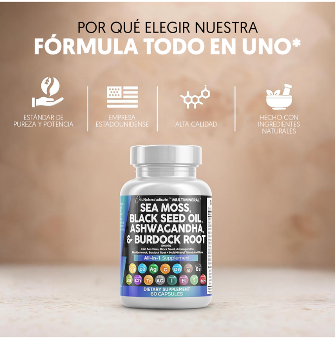 Fortalece tu sistema inmune, mejora tu digestión y luce una piel más radiante gracias a la potencia del Sea Moss, Ashwagandha y Black Seed Oil en una sola cápsula.