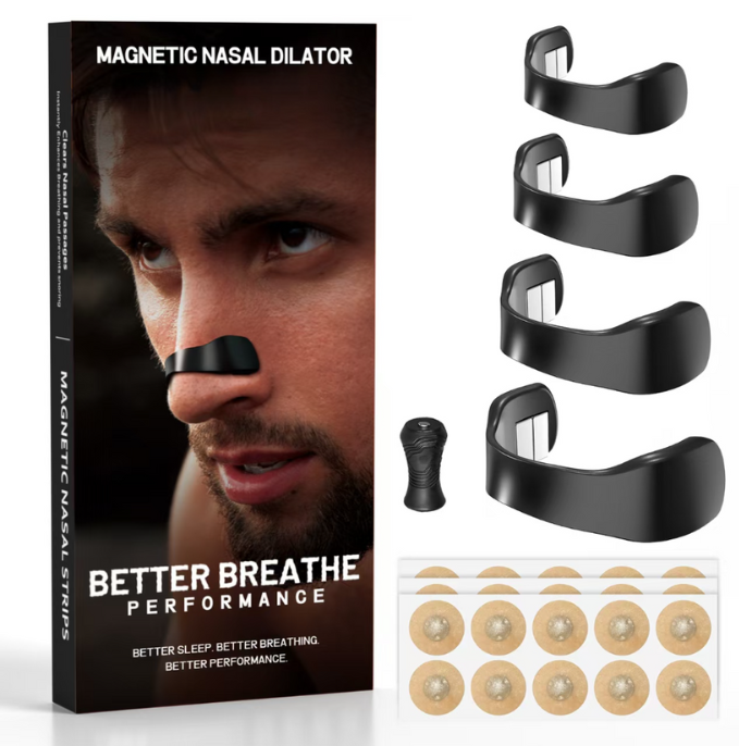 Este dispositivo utiliza una tecnología de dos partes: tiras nasales adhesivas de un solo uso que se colocan a los lados de la nariz, y una banda externa reutilizable con imanes de neodimio extra fuertes. La banda se adhiere magnéticamente a las tiras y ejerce una tracción suave que ensancha las fosas nasales, permitiendo una mejor entrada de aire, sin necesidad de insertar nada en la nariz.